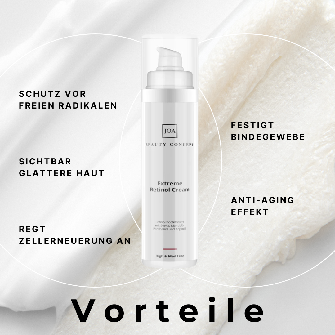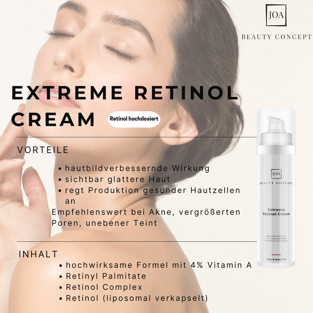 Hochwirksame Formel mit 4 % Vitamin A. Die Creme enthält Retinyl Palmitate und Retinol, einmal als Complex sowie einmal als liposomal-verkapselte Variante. Zusätzlich ist ein Wirkstoffkomplex aus der Steviapflanze mit Vitamin A ähnlicher Wirkung eingearbeitet. Die Extreme Retinol Cream kann für eine hautbildverbessernde Wirkung und eine sichtbar glattere Haut sorgen. Da Retinol die Produktion von gesunden Hautzellen anregt und die Zellfunktionen reguliert, kann es auch bei Akne wirksam sein.