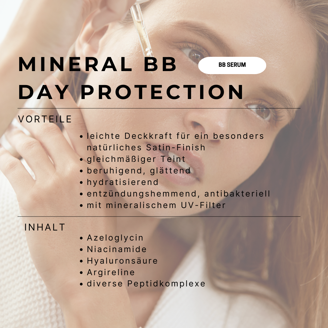 Getöntes, hochdosiertes Mineral BB Serum. Wirkt beruhigend, glättend, hydratisierend, entzündungshemmend und mattierend.