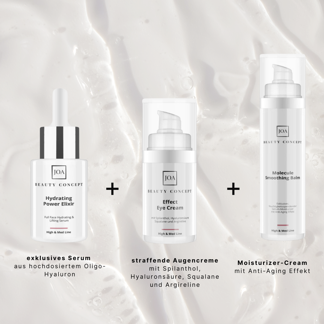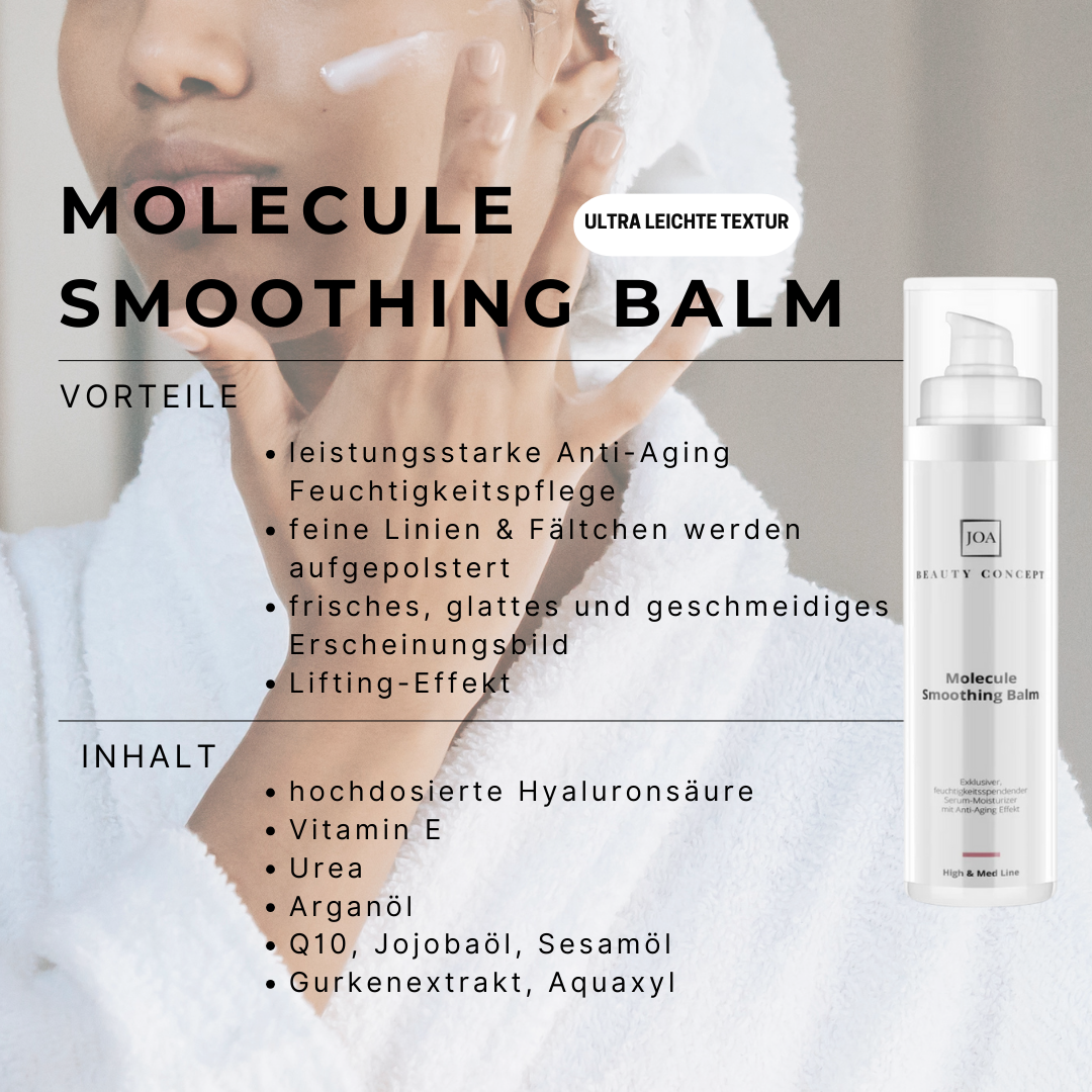 Exklusiver, feuchtigkeitsspendender Serum-Moisturizer mit Anti-Aging Effekt. Der Molecule Smoothing Balm ist eine ultra-leichte, leistungsstarke Anti-Aging Feuchtigkeitspflege in Serum-Molekülgröße. Feine Linien und Fältchen können sichtbar aufgepolstert werden. Der konzentrierte Mix aus hochdosierter Hyaluronsäure, Vitamin E, Urea, Arganöl, Ubiquinone (Q10), Jojobaöl, Sesamöl, Gurkenextrakt sowie Aquaxyl verleiht der Haut einen intensiven Feuchtigkeitskick und trägt zu einem nachhaltig gepflegten Erscheinungsbild bei. Das Ergebnis: ein spürbar frisches, glattes, geschmeidiges sowie anhaltend perfekt durchfeuchtetes Hautbild mit Lifting Effekt.